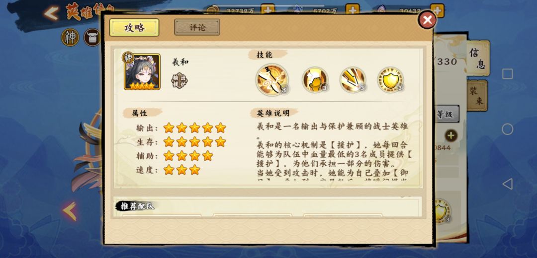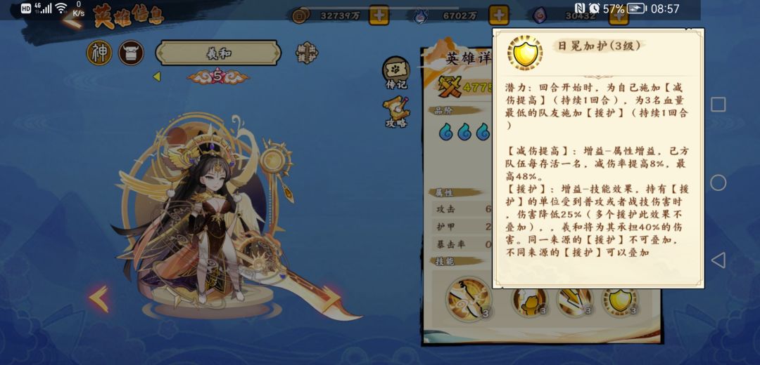 ,援护队友被打也有50%几率触发,每回合最多5层,加上自己触发的,每回合最多能触发两次反甲,伤害不高,且是针对对方血量最高的3名成员,可见这个技能的主要作用是压血线。保护技能