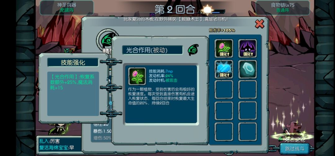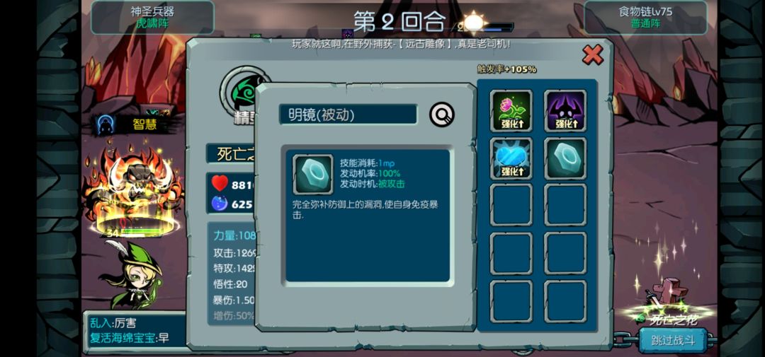 之前过了75,可以强化6阶,技能强化如上图,我是普通部落加百分之10攻击,所以攻击比较高,视频中也是几下就秒了精灵神,然后要再弄一个速度比暗杀快的灵魂封,封对面后排,