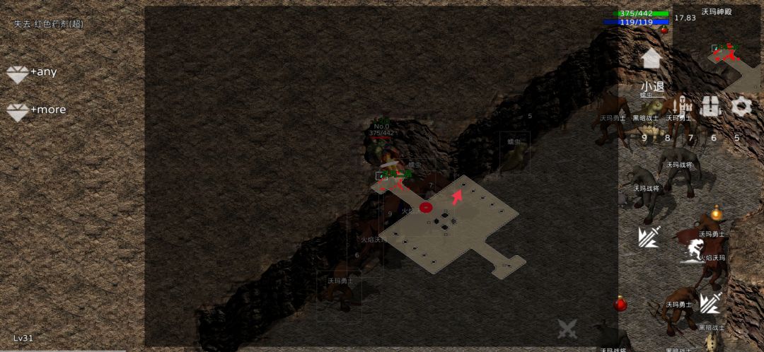 第一种打法进图直接跑到中间正好引不到沃玛教主的地方,再往上把小怪引开,然后直接往中间跑。如图所示