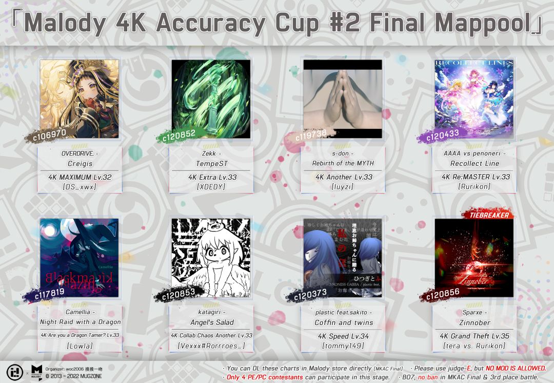 - MKAC 4K准度赛半决赛已全部结束,昨晚结束的T0m0 vs Abeyuu的比赛颇为刺激惊险,双方3:3打进TB后最终Abeyuu以0.1%以内的微小差距战胜T0m0获胜,恭喜Abeyuu和MRCA选手进入总决赛!