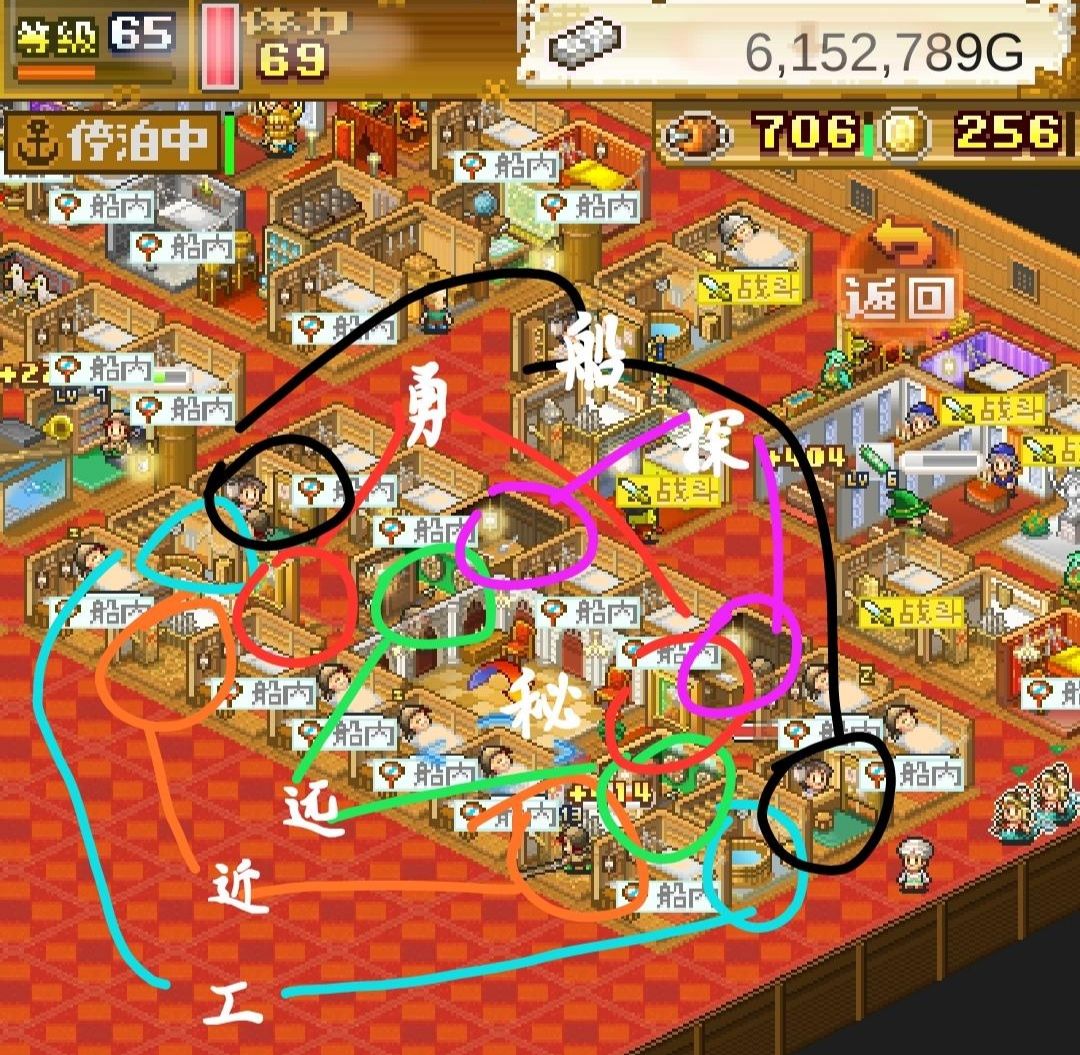 左上角6个商店,厨师转的,后期岛上的房子全5级后就不需要开商店了,把厨师转成召唤师或农夫去种地