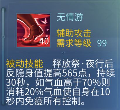 关键点:蝶客免疫控制的技能较多,寄·孤客释放后有10s左右免疫控制、70绝释放后有16s免疫控制、无情游天赋下释放祭·夜行将有10s的免疫控制