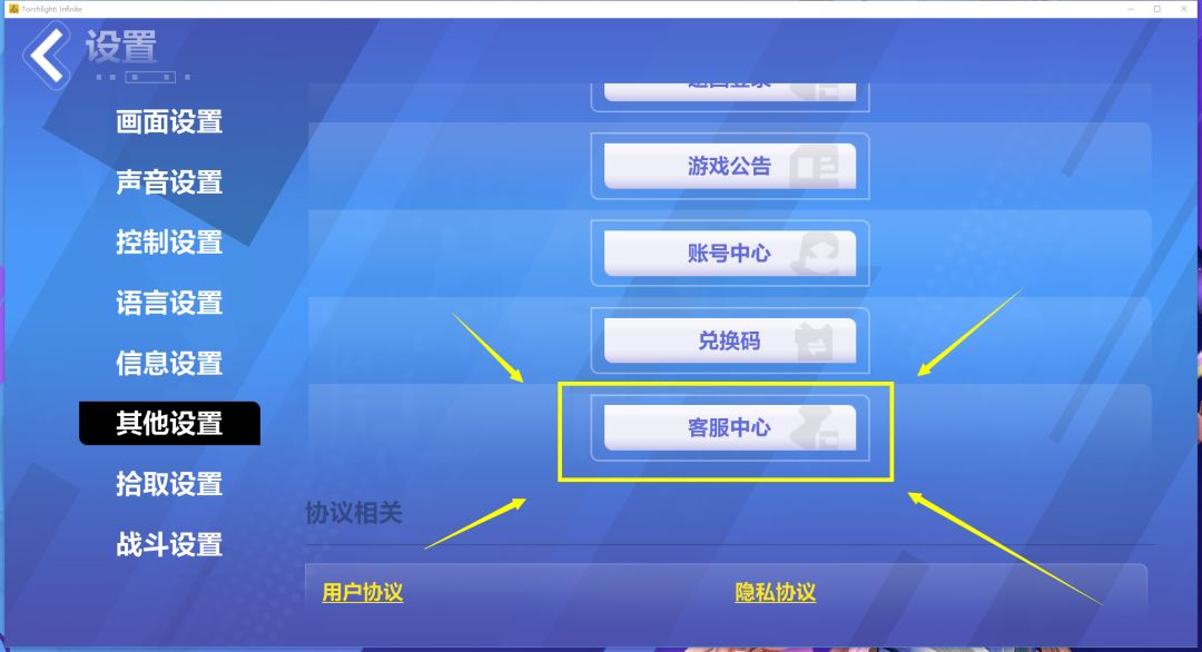 若在远征《火炬之光:无限》国际服时遇到充值不到账、游戏数据有误、禁言封号、账号遇到BUG等一切需要查询数据验证数据的问题时,请通过游戏中的客服中心进行提单解决。