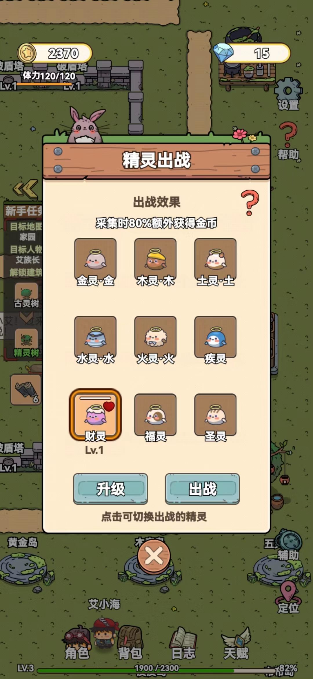 开局先捡取艾族长上面的宝箱,里面有1000金币,30钻石等,后面会用到。完了,再跟艾族长对话做任务。任务主要是引导的基本操作流程,艾人的老玩家可以快速跳过。期间不要乱花钻石,解锁了精灵树,先去招募一个精灵带着。运气好,招募到一个被动好的,帮助不小。这个精灵,到了防守阶段,可以帮助一起战斗。