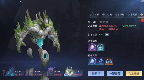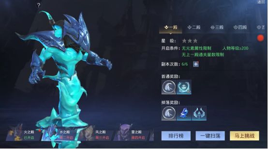 每个秘境共有20殿,副本玩法相对简单,只需要在限定时间内击杀所有怪物即可,但是下一殿需要三星通关并且元素属性达到要求才可以进行挑战!