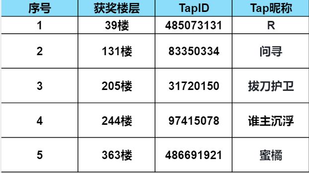 本次“TapTap5w预约里程碑达成”活动最终有效楼层为403楼,我们将从这403楼中挑选5位幸运少侠送出奖励~快来看看有没有你吧~