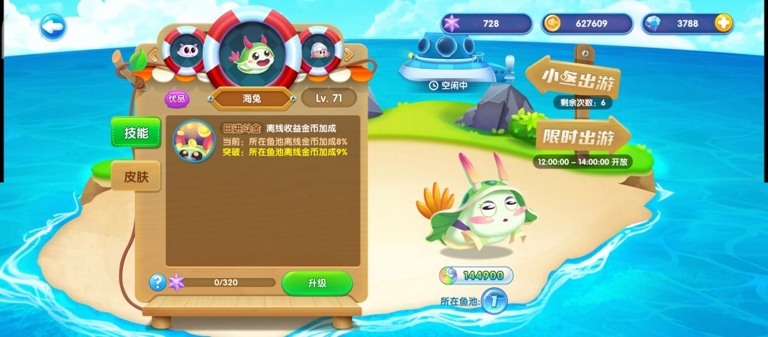只要抽到20个碧玉突破石就可以兑换海兔,海兔的技能非常的被动,是在一个鱼池的金钱加成,我推荐大家把产金币高的鱼都放在一个鱼池里面,然后加上海兔,能让离线的金币加成更高一下。