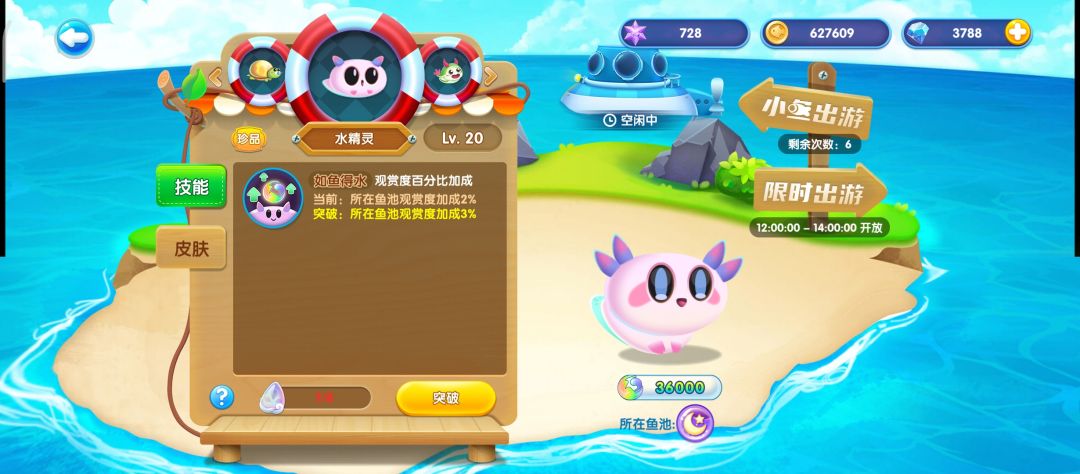 水精灵的获取方式是贵族4,另外突破的法,贵族4每天送一个突破石,他的技能是给鱼池加观赏度的,等级越高,观赏度加的越多,我推荐把他放在观赏池里面或者觉醒鱼池里面,毕竟其他的鱼池观赏度高也没什么用。