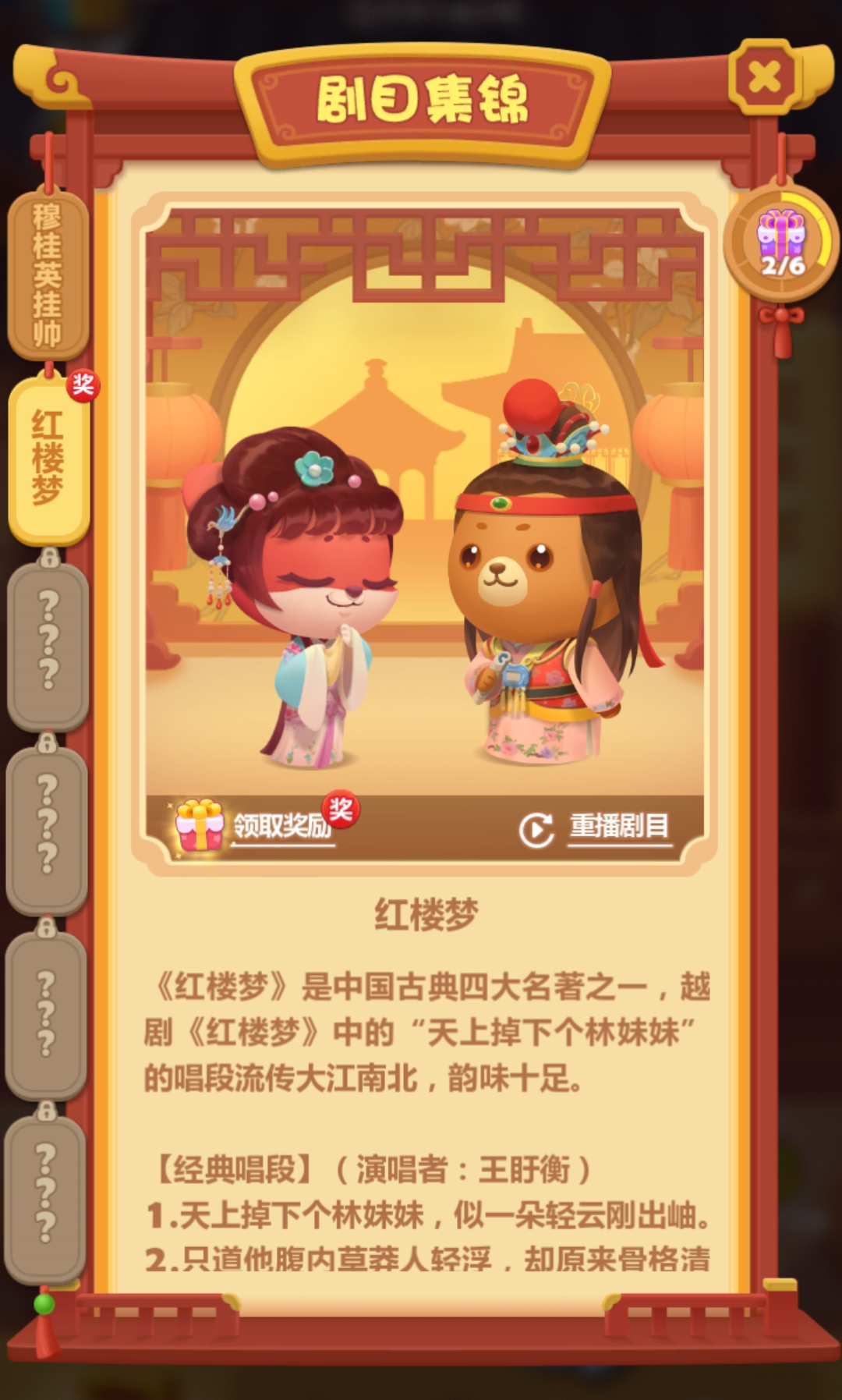 揭开全部幕布后便能欣赏对应剧目唱段,并将其收藏至剧目集锦之中。小村民们可在集锦内重复欣赏剧目唱段、观看剧目介绍,还能点击礼盒领取收集奖励,集齐全部剧目时便能获得紫色成就卡。