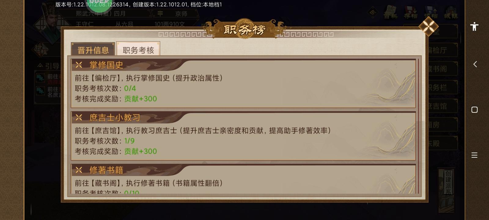 2、接下来怎么玩,是完成职务栏的职务考核吗?这考核这么多,我都没时间读书和修著了,所以接下来不用注重读书了吗?