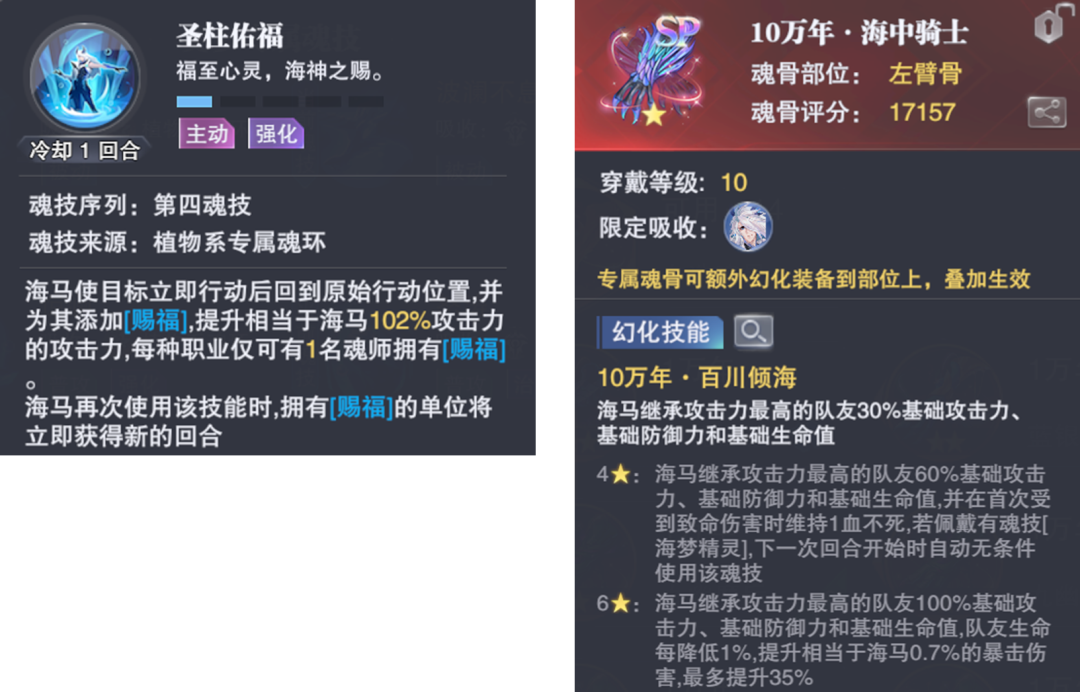 首先海马的左臂骨专属魂骨可以为其继承攻击力最高队友一定比利的攻击、防御和生命值,最高6星状态下可以100%继承,然后再配合4-1技能【圣柱佑福】的攻击力施加效果,这样就能为我们的主C提供非常不俗的短图增伤了,另外海马的2-2被动也可以提供一定的增伤效果,其为何有如此亮眼的表现就在于此,所以如果大家的海马专属魂骨有更高的星级,那么结果也是更为可期。