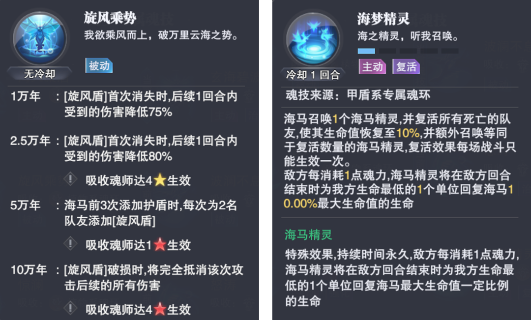 海马PVP的神技其实主要就集中于2-1技能【旋风乘势】和4-2技能【海梦精灵】上,虽然说今天PVP战斗测试的场次并不是很充分,但也可以充分的看出海马对于SP千仞雪阵容的针对性克制,其中【旋风盾】在这方面就发挥了极其重要的作用,不过前提是需要大家的海马尽量达到红色4星才能发挥其完整的强度特点。