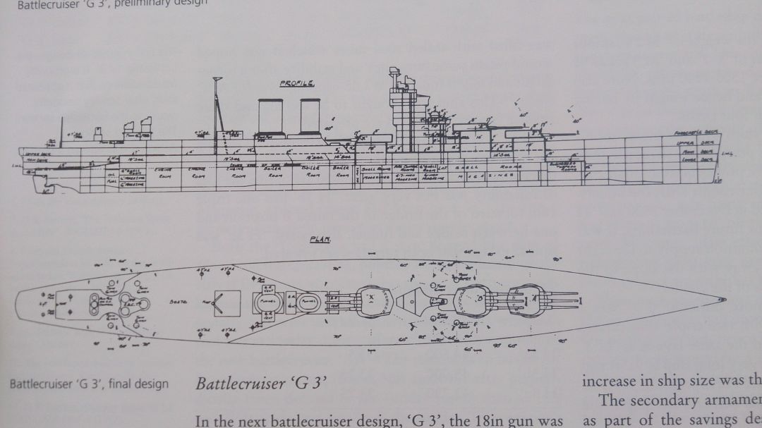 上图:英国1921年的G3方案,装备三座三联16in主炮、12~14in的主装与4~8in的装甲甲板,航速可达32kn。其设计者包括时任海军建造总监(Director of Naval Construction)戴因考特、阿特伍德与日后的建造总监古道尔