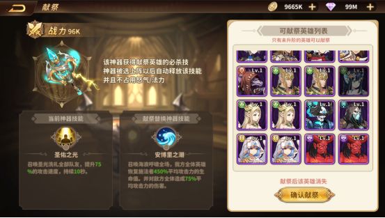 值得注意的是,献祭英雄会消失,献祭的时候大家要考虑清楚噢。另外每个神器都可以献祭不同的英雄噢。