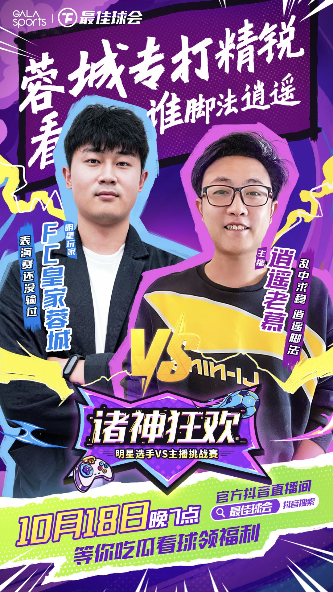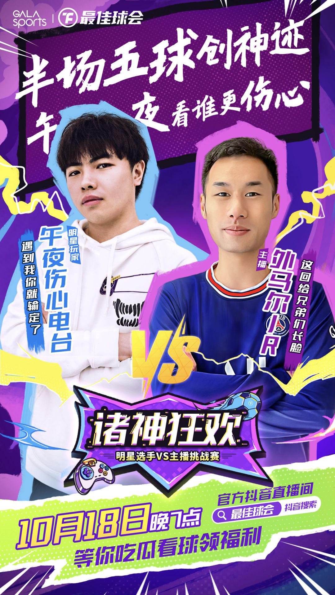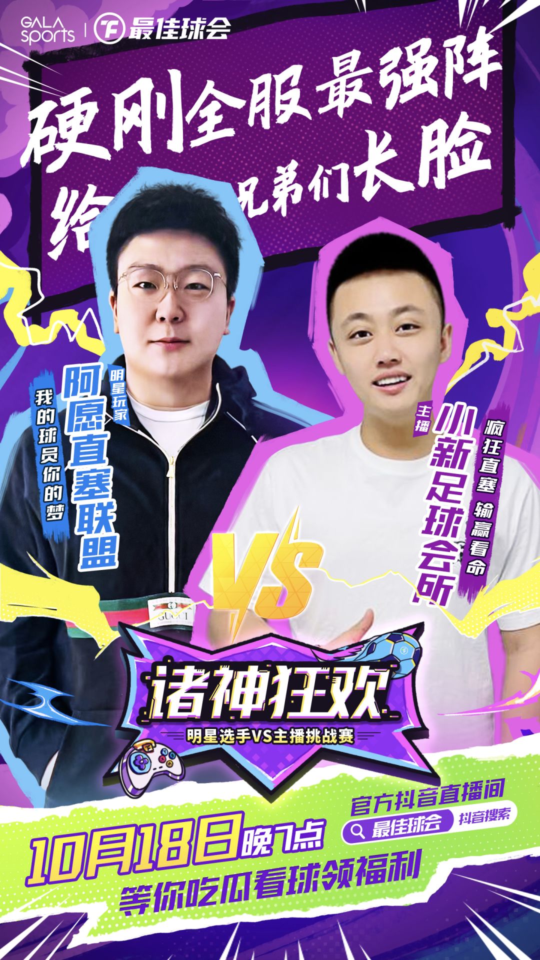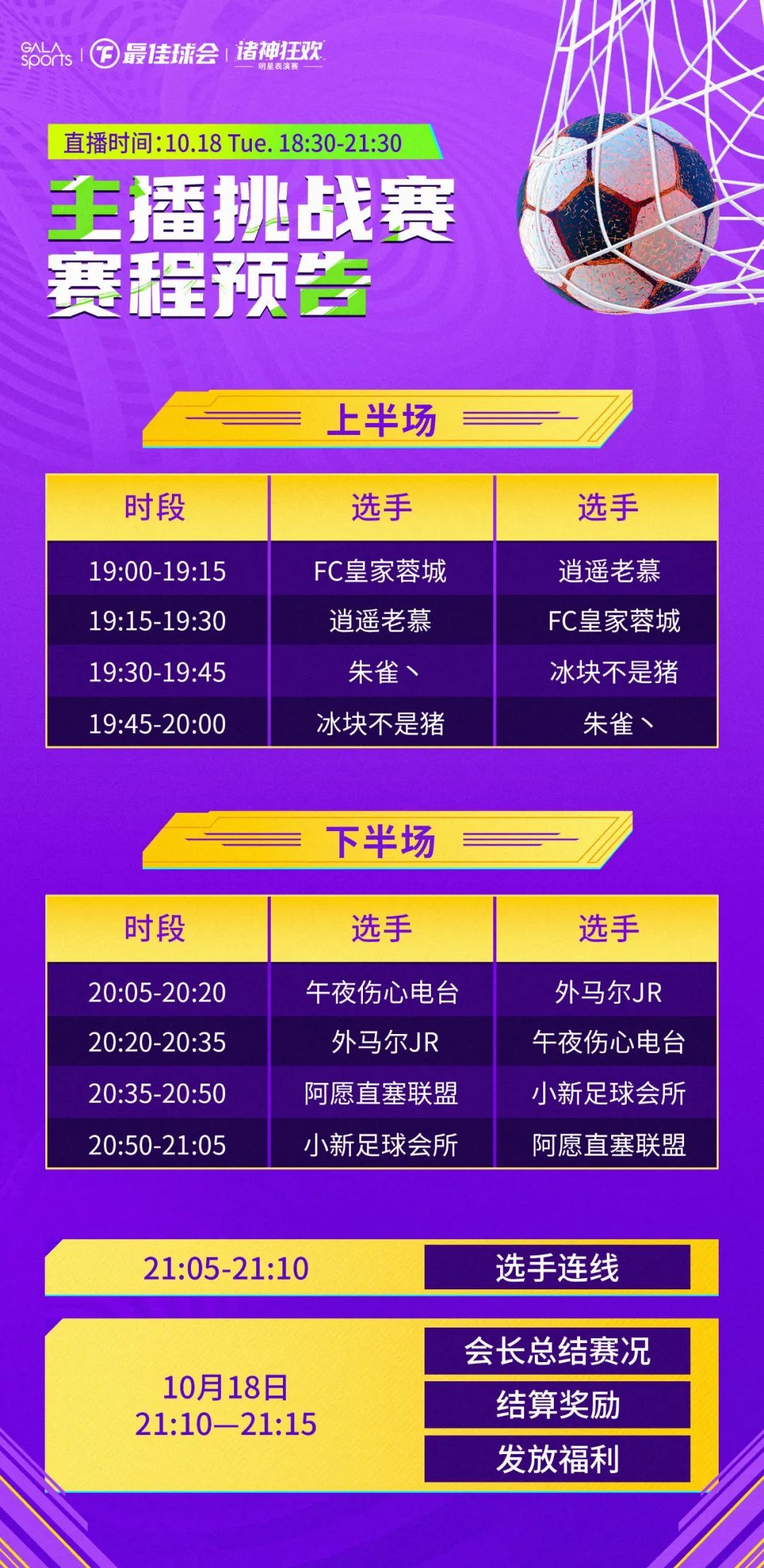 别急,还有!“诸神狂欢”最佳球会首届明星表演赛Day3谢幕战【主播挑战赛】将于今夜10月18日19:00打响!