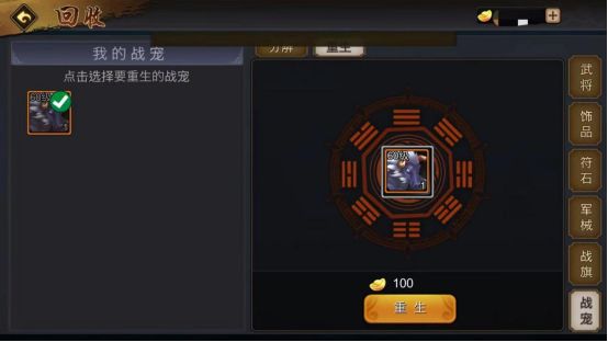b、重生——传承:如果主将已经有了主宠,准备转向培养食铁兽,那么重生已有主宠,并把重生后的资源转为培养食铁兽,是最简单的方法。