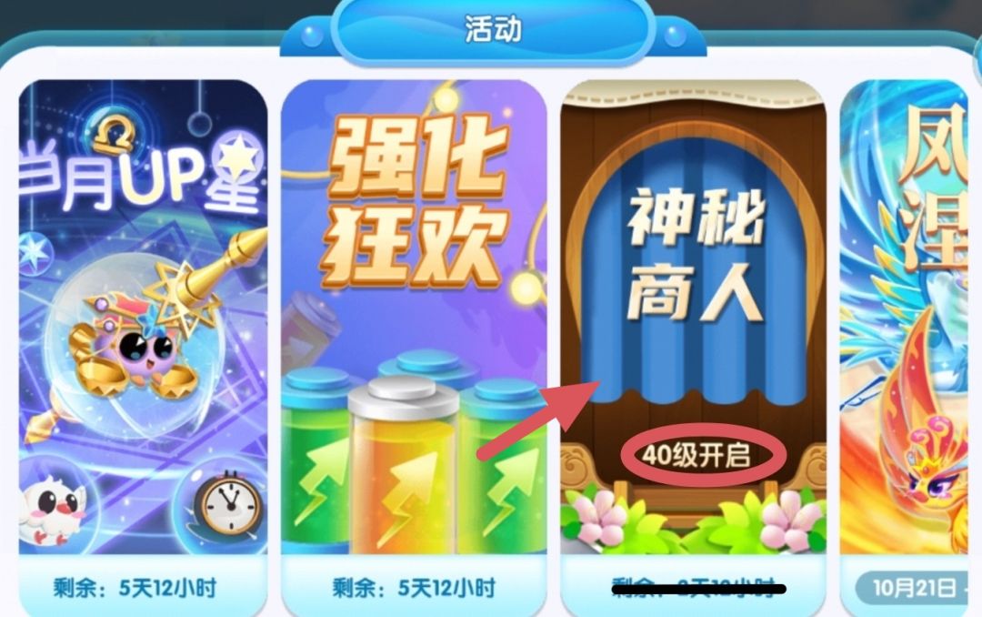 点击之后我们进入到下个页面。神秘商人40级开启,达到等级的鱼友在看到活动出现神秘商人后,就必须要存皇冠鱼,不能强化和放生。