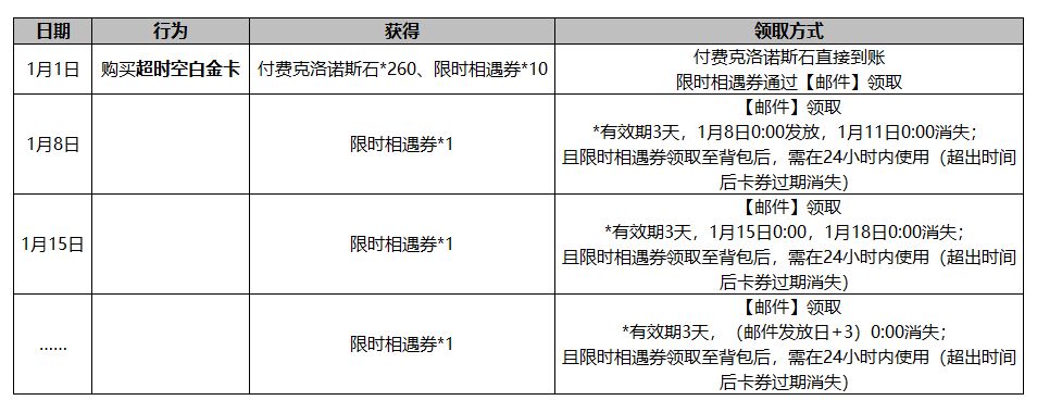 • 玩家A在1月1日 10:00购买了超时空白金卡,直接获得【付费克洛诺斯石*260】,并通过邮件领取【限时相遇券*10】的奖励;