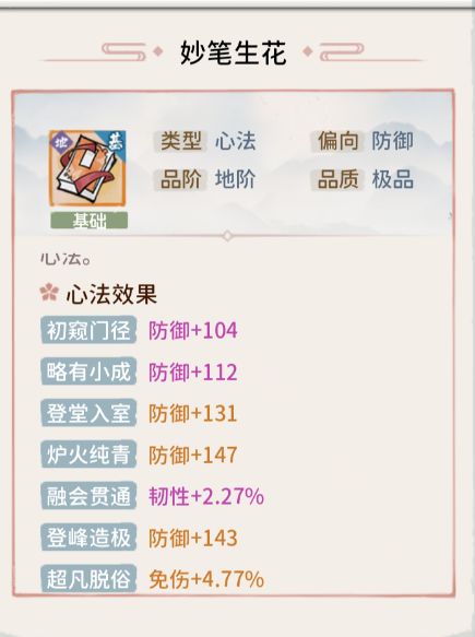 心法参悟也有些门道,可自行找有关攻略,我要提的是对应属性的心法只会出相应的心法,如攻击只会出攻击,但参悟出的类型是随机的,可通过参悟普通心法得到秘笈和御宝心法。前期不用追求极致,推图不卡就行,因为前期心法淘汰比较快,而且推图也可获得心法,没必要花太多的资源去参悟。