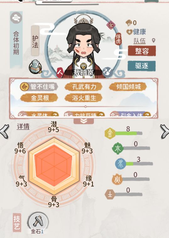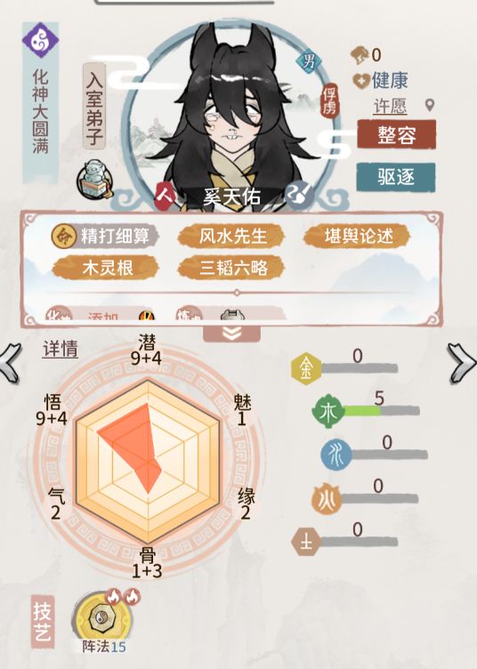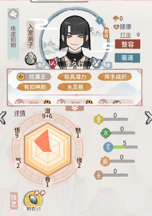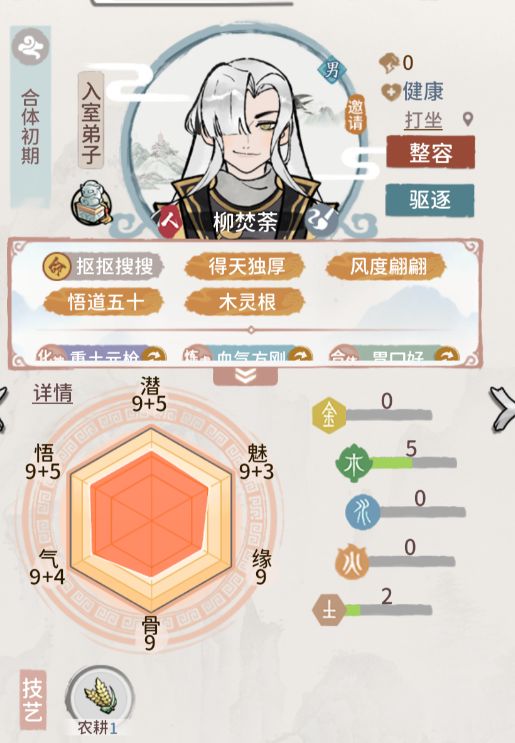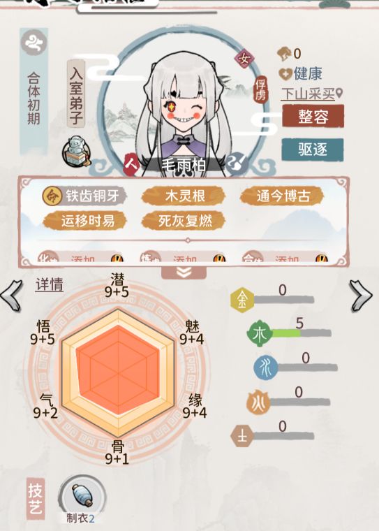 二是对于工具人的数量,金石一共需要10个(这类高技艺的比较难得,野外碰到8以上甚至是7以上的差不多就可以邀请了),伐木需要5个,农耕需要4个,提升型工具人虽说都各需一个,但若是有高技艺的也是可以招募,12技艺的弟子可以写书,得到相应技艺+1的心法,比如一个炼器11的弟子,吃完野外的炼器+1的属性点就可以到12,注意:邀请弟子和俘虏是不可以写书的。(附: