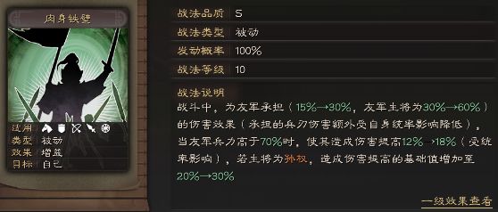 周泰自带战法肉身铁壁,类型为被动战法,效果为:战斗中,为友军承担(30%,友军主将为60%)的伤害效果(承担的兵刃伤害额外受自身统率影响降低),当友军兵力高于70%时,使其造成伤害提高18%(受统率影响),若主将为孙权,造成伤害提高的基础值增加至30%。周泰的战法可以为队友带来极大的增益效果,为队友承伤的同时还会为队友提供增伤效果,战法效果十分出色。