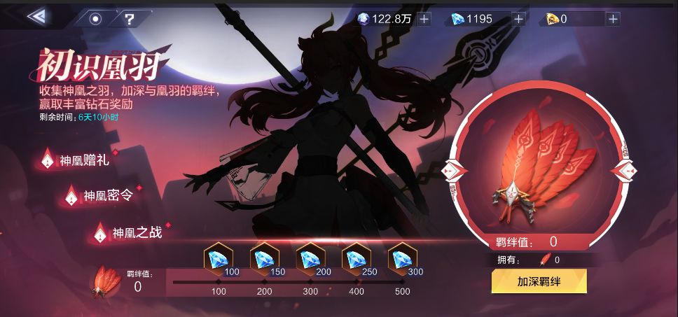 ◆活动期间,指挥官可通过神凰赠礼、神凰密令、神凰之战收集神凰之羽,加深与凰羽的羁绊。当羁绊值累计到一定数量时,将会获得相应档位的钻石奖励。