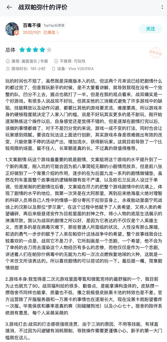 评价君:本篇评价从文案、游戏本身、打击感等各方面详细测评啦战双的优缺点,并深度分析了游戏剧情给玩家的感动之处,让不少玩家都深深共鸣了呢~感谢百毒不侵君的认真评价哟!![[嗒啦啦4_抱住]](https://img.tapimg.com/market/images/b20ce7752ccda6d1a19a716bf3990252.gif)