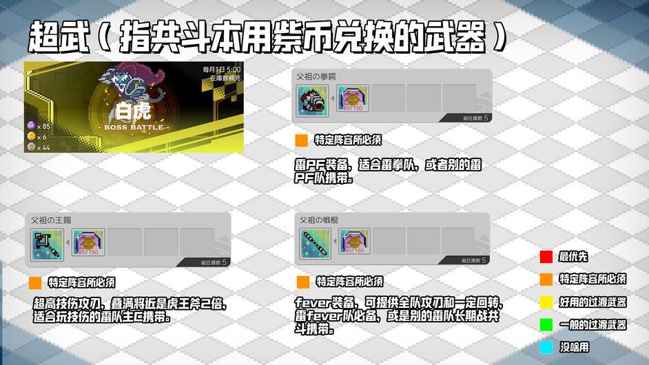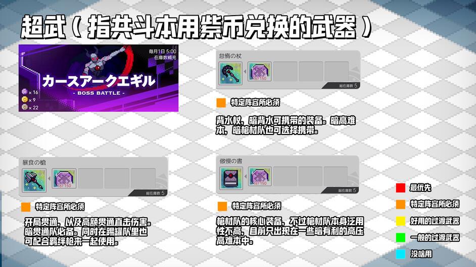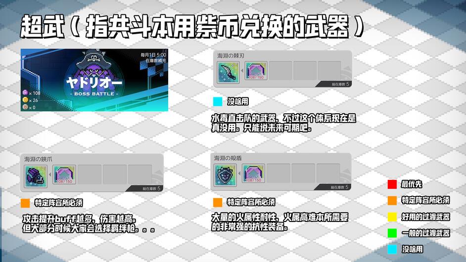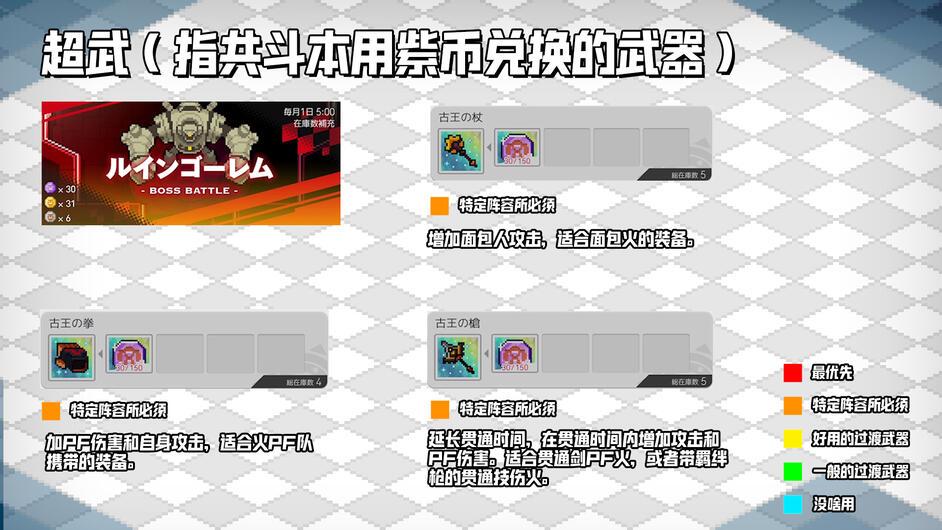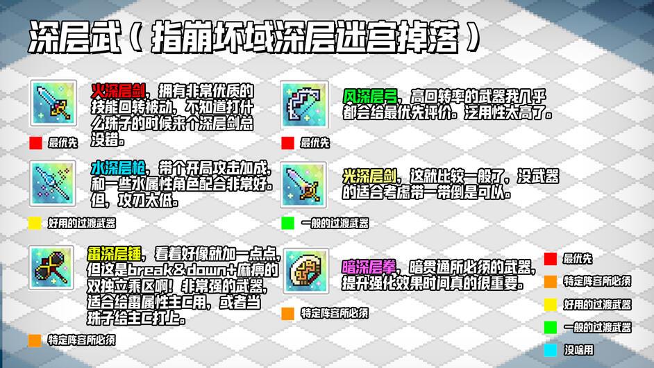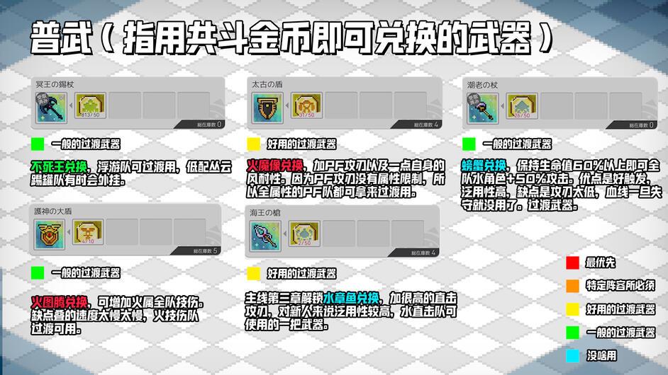 逛半天论坛都没有给新人武器获取推荐的,搬运下Wiki的。(ps:只是作为参考,实际按自己队伍需求去刷)