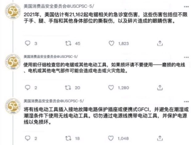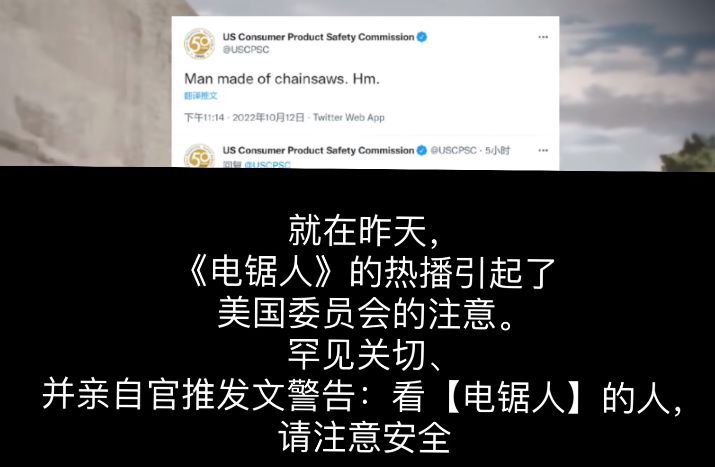 另外值得一提的是,就在《电锯人》第一集刚播出不久,美国消费安全委员会紧急发推,提醒观众小心谨慎观看、并谨慎模仿使用电锯。