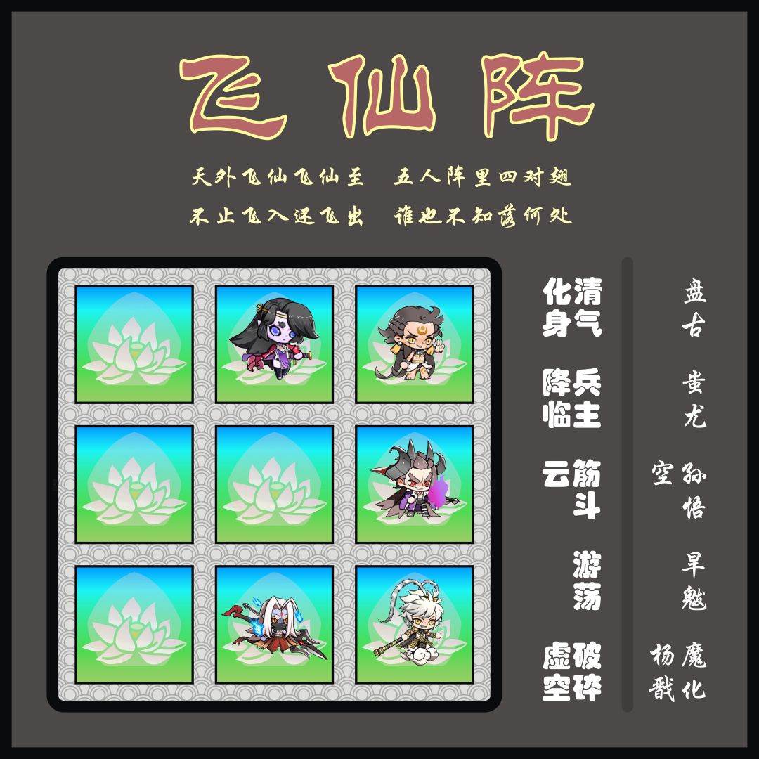 嗯。。。还是个谐阵。。。飞仙阵就是集合了大多能飞的仙人攒出来的一套阵容,这里没选魔力青而是改用盘古,一是青真的太脆,先手肯定会迈出一步挨打,二是需要盘古的解控来防晕眩和封印。为了点题,旱魃选用二卡是真的可以飞来飞去,但确实是个乐趣十足的玩法,有兴趣的可以在终极模式下试一试。其他还真没啥好说的。