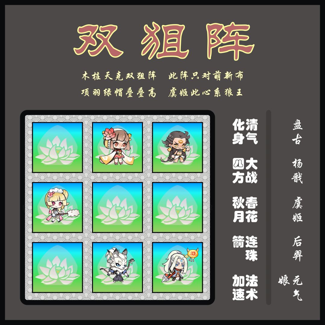 双狙阵是选用两个针对最少血的单体绝技的仙人:后羿&虞姬。虽然木桩天克这俩仙人,但虞姬带上真伤符石后,可以为后羿扫雷,让后羿打出真正的伤害。所以该阵主角就是后羿,为此,虞姬及其卡牌负责给后羿叠攻击,杨戬和元气娘的卡牌给后羿让其自己快速叠出高物攻,这样快速叠出高物攻的后羿也具备了顶流法仙的输出能力。