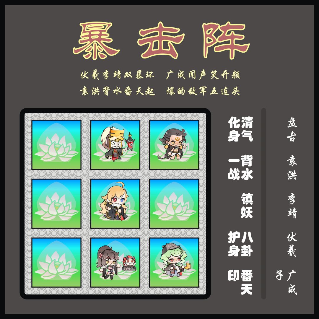 现在没了伏羲是真的少了很多乐趣,比如该阵李靖和伏羲的列暴击光环,可以直接加400暴击,若再配上精心调制后的广成子,广成子基本是出手就暴击,暴击就能禁疗。然后利用净化或盘古卡牌在中期来洗掉递减的暴击,再利用“番天印”和袁洪的“背水一战”可以让广成子随时重启状态具备必杀一击的效果。