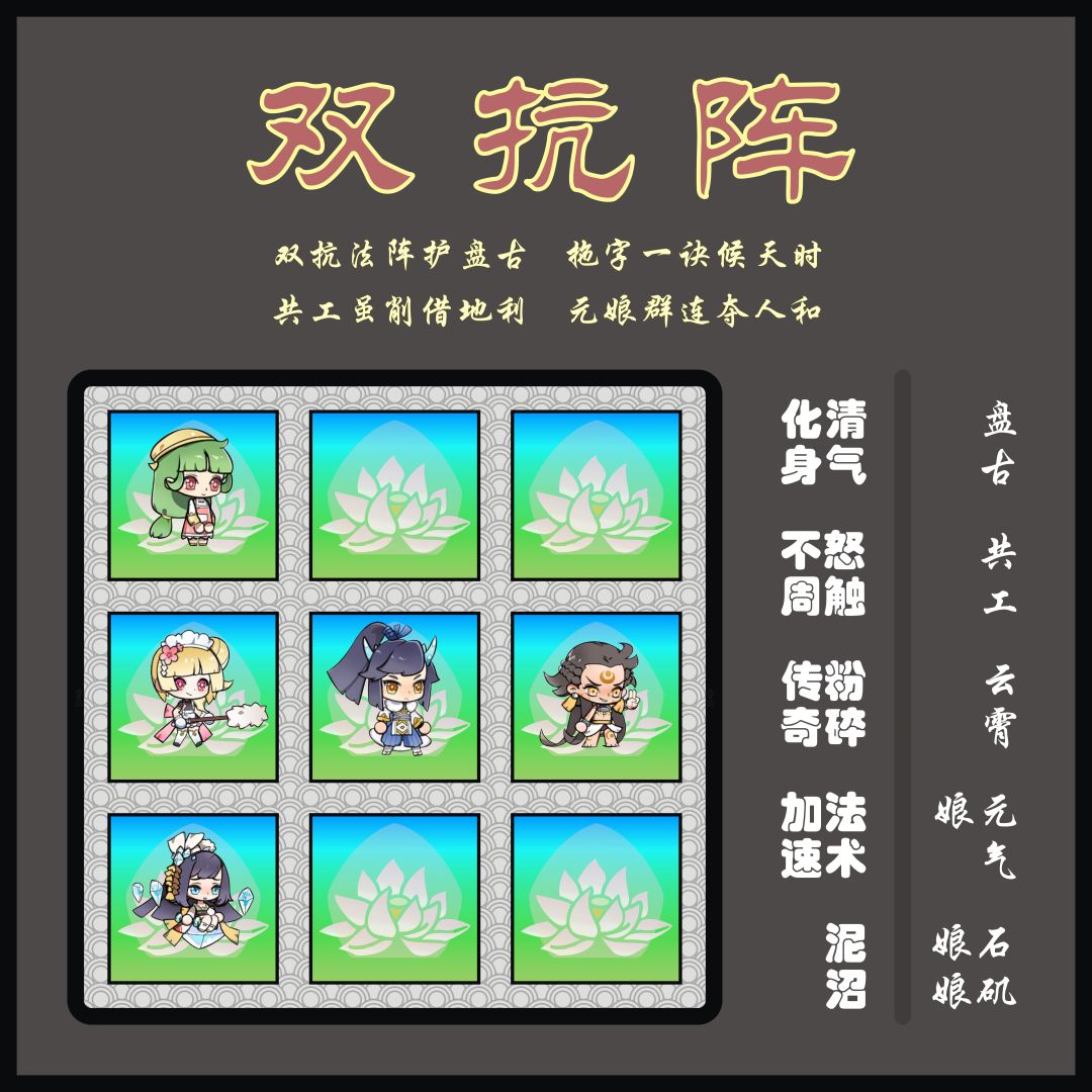 双抗阵是在四法阵的基础上稍加修改而生,主要是利用共工的己方群体法抗和石矶的全场物抗来提升盘古的站桩能力。至于面对轩武阵时如何拖,主要是利用柳岸盘古和元气娘的开局双木桩,放在盘古初始位的上下来卡住对面上下午武仙,防止突入。共工虽然被石矶削了输出,但借助“怒触不周”在自身绝技轮去贴针对目标,利用自身的近身削减物防来抵消这点降低的输出。元气娘在之前四法阵的理想环境说过,这里不赘述了。
