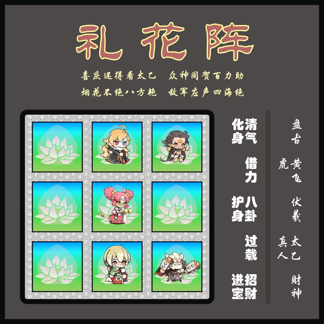 礼花阵的主将肯定是太乙,凭她的七段礼花绝技,选择伏羲财神这种可持续提供元气的仙人作为保障,再利用黄飞虎卡牌复制太乙的过载,面对人机时基本可以在中后回合时让太乙持续进行狂轰乱炸。