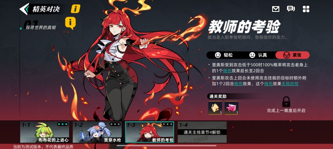 游戏采用三角色上场+三角色替补的的战斗模式。在PVE的对战中,顾问们首先体验到的就是就是【冒险玩法】,也就是大家所熟知的主线剧情。【冒险玩法】中的敌人会随着主线任务推进而逐渐变强,挑战成功将会解锁新剧情。此外,完成每个大章节的主线任务后,【精英对决】玩法随之解锁,在这里顾问们可以挑战特定角色,挑战难度分为“轻松”、“认真”与“紧张”三种模式,挑战成功即获取道具奖励。