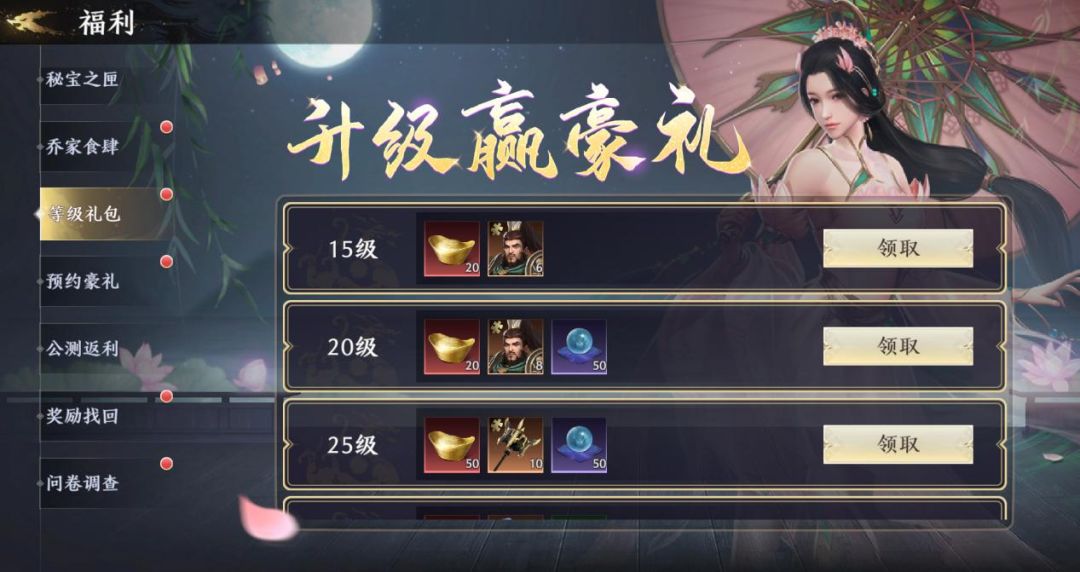 活动说明:公测开启后,将军登陆游戏创角后即可参与,将军到达对应等级,即可领取对应的【等级礼包】,如灵玉、招募帖、武将碎片、元宝等海量好礼!助力将军闯荡无双世界。