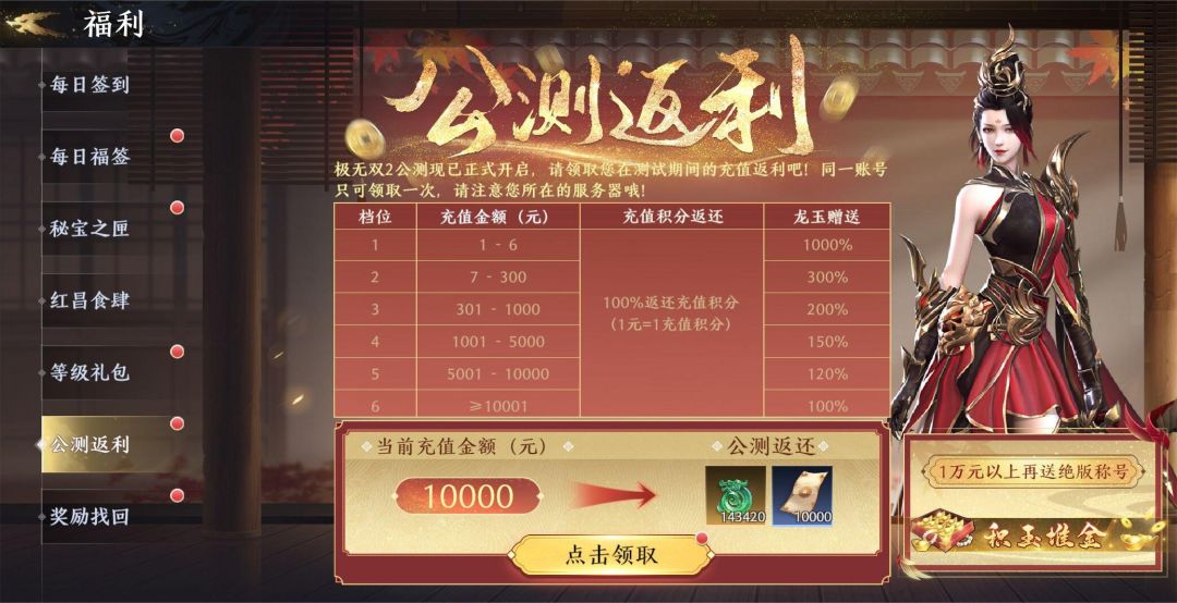 活动说明:在本次公测开启后,将军可按照累计充值档位,获得对应比例的返还。需要注意同一账号只可领取一次,领取时需要登陆您燎原测试下载渠道及账号!