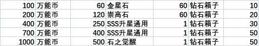 五星许愿树奖励:小型体力药剂*15、奶鸡饼干*450、SSS升星通用碎片*1050