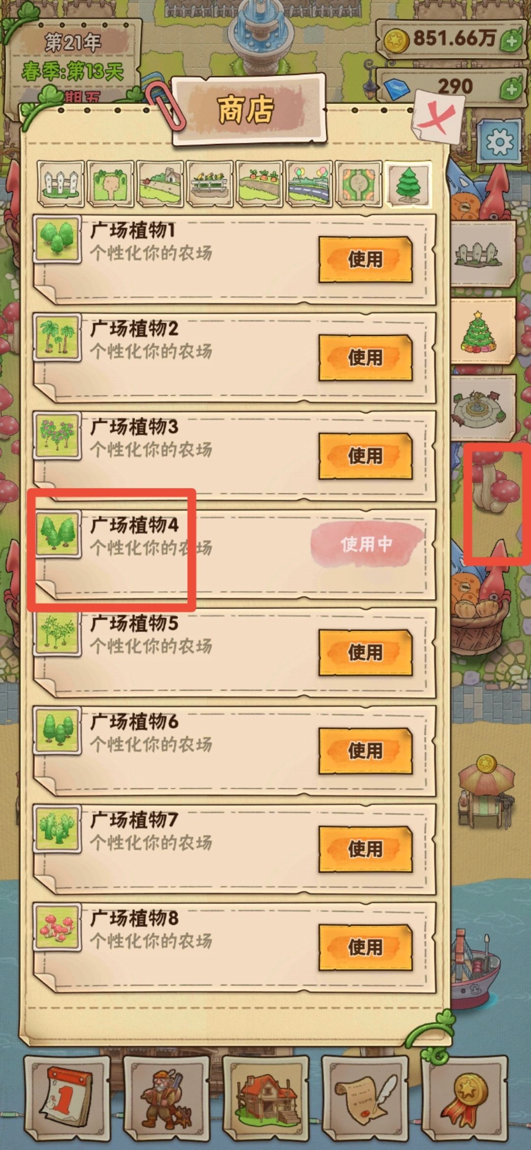 我又双叒叕来了,发现了新bug,如图所示,在商店购买的广场植物,虽然没办法放大预览,但是明显图片与实际给的植物是不相符的。比如我看到是个椰树,但是返回主界面就是普通小树苗,看到图片应该是粉蘑菇,结果主界面是椰树(PS:我有个建议,商店里买东西能做预览吗?图片好小,有时候看不清😔)