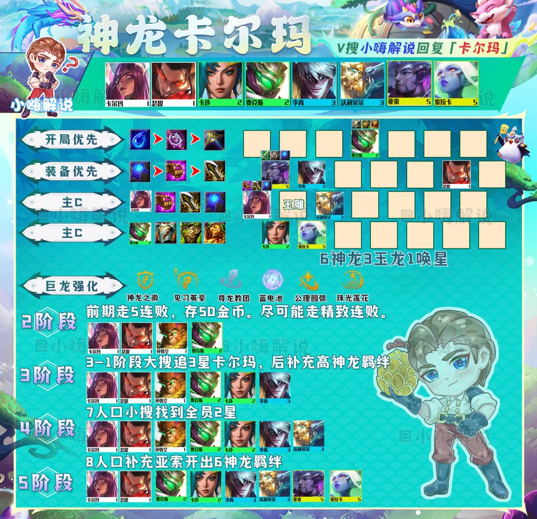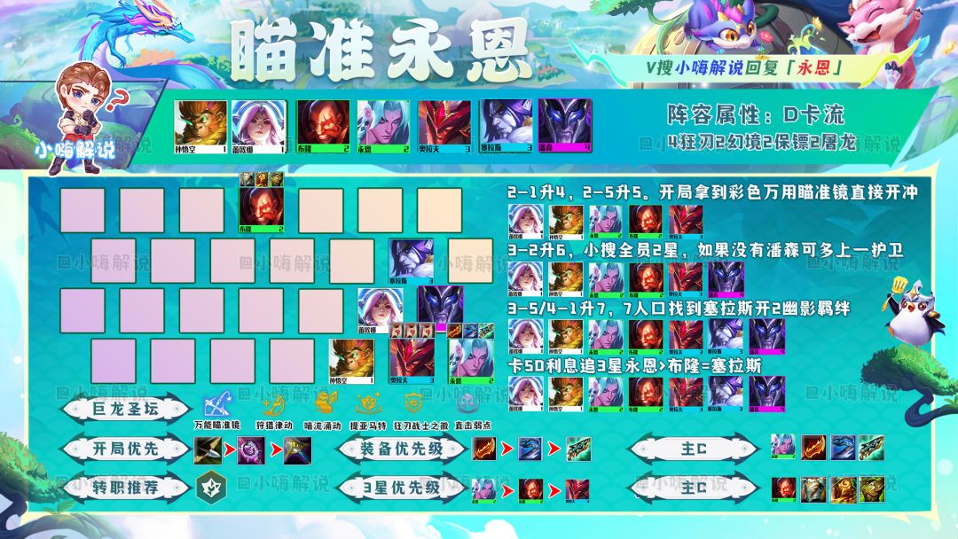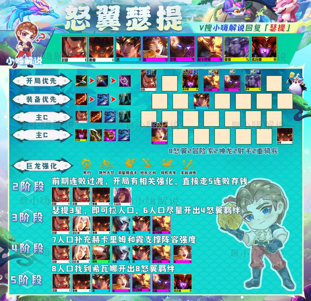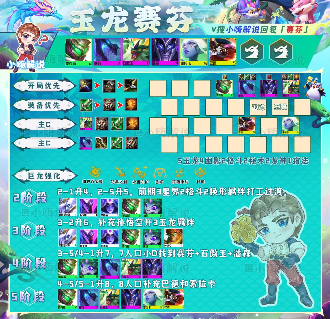 玩玉龙赛芬跟其他高费卡阵容一样,运营是非常重要的。小嗨力推用星界玉龙过渡,奈德丽和孙悟空谁先2星就用谁来打工过渡,有日炎斗篷一定要先做,其他装备则优先做汲取剑和正义之拳这两件回复装。