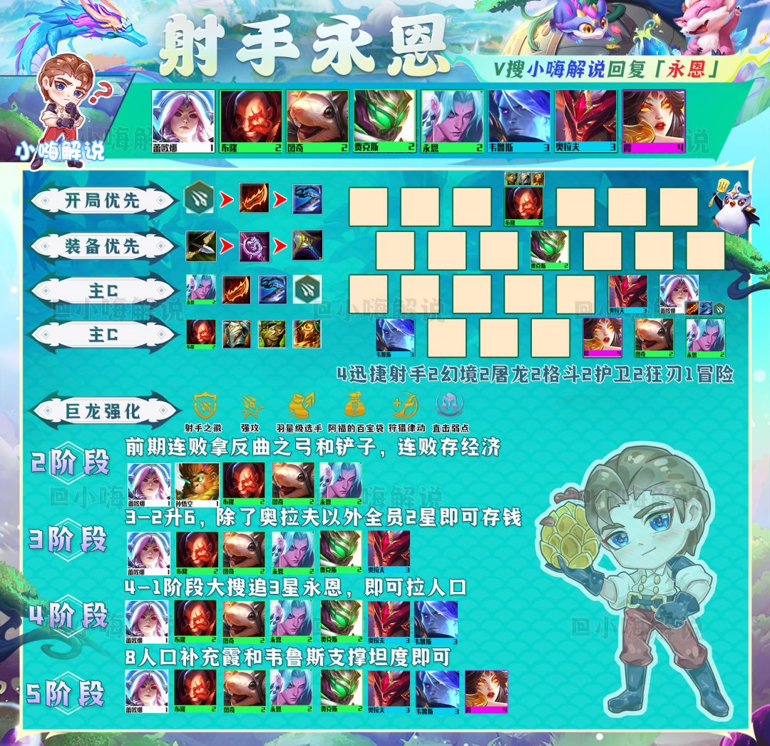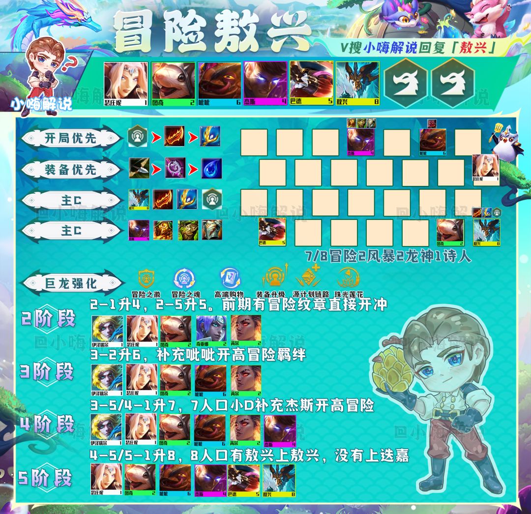 阵容解析:其次开局有冒险纹章,冒险敖兴也是一套不错的选择。冒险敖兴阵容强力点在于,中期如果拉不到9人口,可以考虑中后期可以选择迭嘉来C。迭嘉的法伤是非常适合没有敖兴前打工过渡。