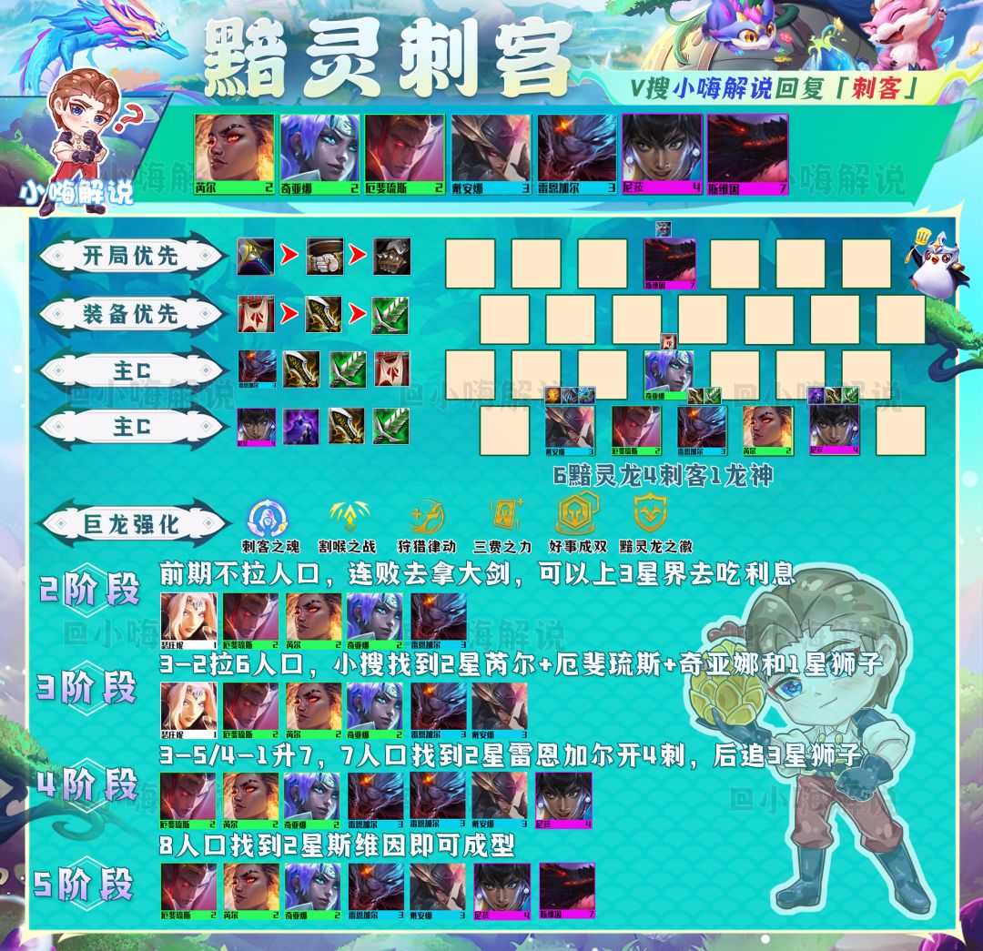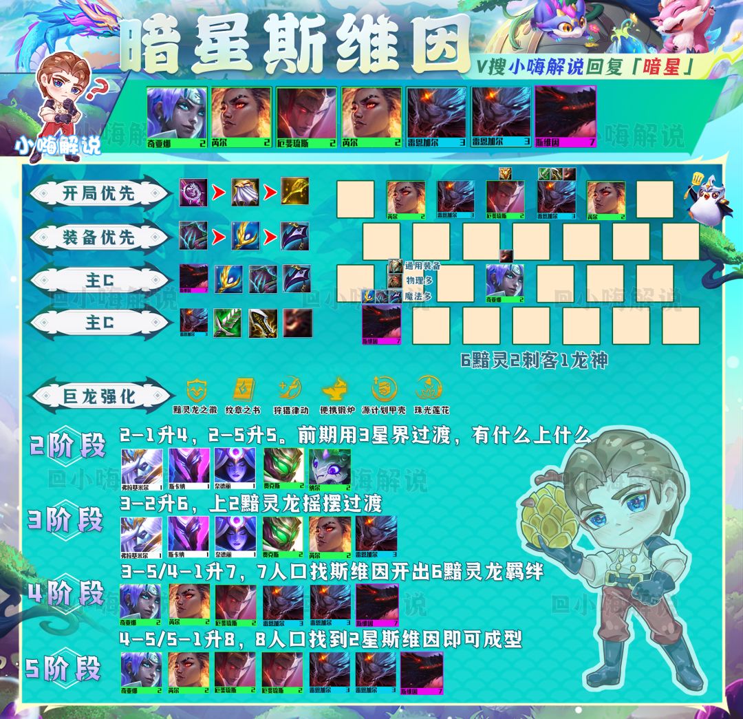 阵容解析:新版本斯维因得到了加强,2星斯维因的技能伤害得到了新的提升,在上个赛季雷恩加尔就已经是敖兴的克星,如今斯维因的增强,也意味着黯灵刺客的伤害大幅度提升,因此新版本雷恩加尔阵容优先以搭配6黯灵龙为主。