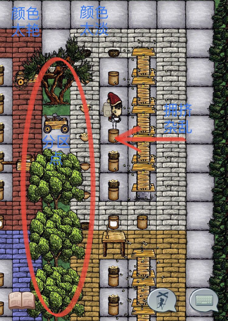 蜂箱区我觉得扁石位置要四列才够,因为旁边要修小岛。导致我的蜂箱区挤的很。 颜色选白黄好一点。红蓝看起来太花了。