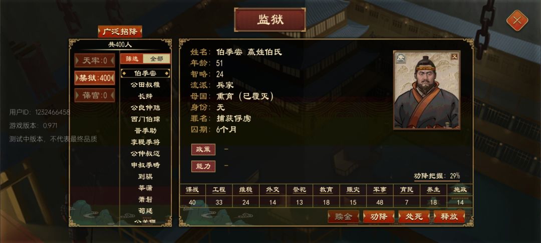 “禁府”加个“一键处死”,或者加个“全选”功能吧,我攻城掠地那么快,这几百人我要按到什么时候,而且还是无效操作,门舍也是一样,不想要的门客要么筛选后加个“一键驱逐”,要么加个筛选后“全选”功能,这其实是合理的,假如自己是国君,要处死个人,是不是一句话“将甲乙丙丁等人处死”,这效果都是一样的,而游戏里却要一个一个人点,操作太那个啥了,驱逐也是同理,“将甲乙丙丁等人赶出都城”,参照君主言行,用现代游戏方式表达出来才是正确的,不要太刻意的,一个命令确定一下
