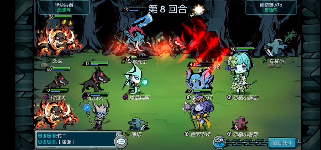 除了对面基英进化一些带范围伤害的主动清掉招狗外,基本上稳过,就开始可能因为兽魂只有57触发容易没触发兽魂直接死掉,我们需要刷一下性格或者缘分,等精灵之心每回合叠加6触发就行了,我下面视频开头永动机就是因为触发没叠起来就死了一个,我当时怕永动机蓝不够,上了两个,最后看来是多虑了,具体看下面视频