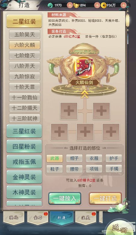 高级装备除了通过BOSS掉落以外也可以通过打造获得。5阶以上红色极品装备可通过消耗5件等阶的橙装进行合成打造。红装的属性更为强大,各位上仙获得了无用的橙装之后不要急着熔炼哦,还可以用于打造红装的材料。