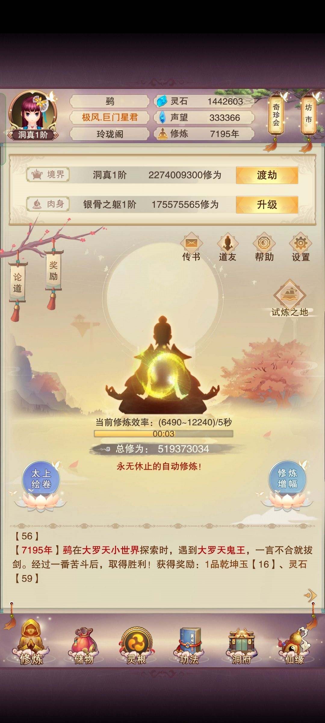 道浩历7195年,我历经磨难突破洞真,不得不说现在的节奏是真快啊,7000年就洞真了,想当年老区七千年还在大乘摸爬滚打,虽然现在节奏变快修真世界功能也变多了,但修真世界注定是一个烂尾游戏了,大家所有的意见全部都会被送到凡人传说策划组,可以说修真世界已经不太可能有新功能了
