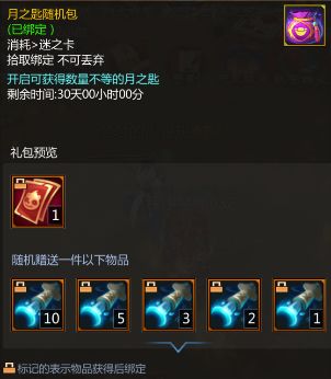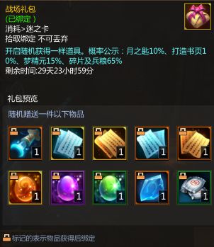 在战场礼包中,大家将随机获得月之匙、各类打造书页、梦之精元、封灵玉碎片其中之一。