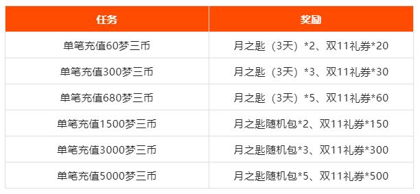 在月之匙随机包中,可获得双11礼券*1和随机数量的月之匙。单笔充值梦三币满5000以上即可获得全部奖励。