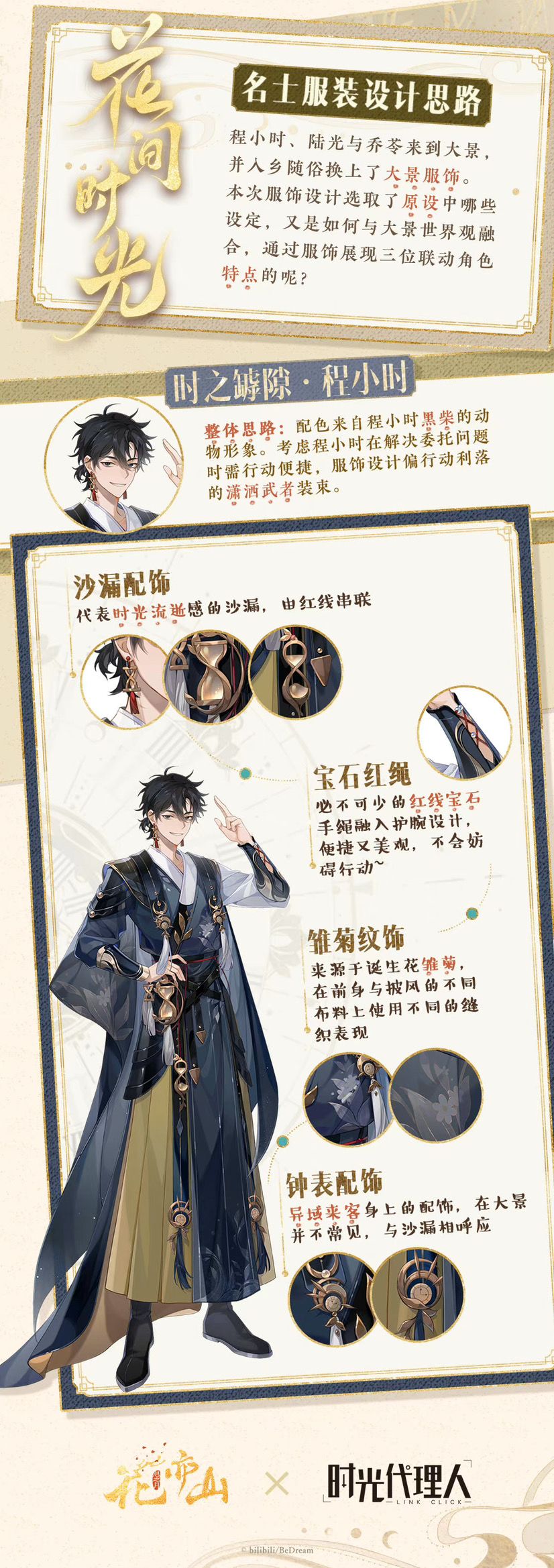 《花亦山心之月》×《时光代理人》联动特别主题活动「花间时光」已开启,程小时、陆光与乔苓在宝石红绳的影响下来到大景,也入乡随俗换上了大景服饰。